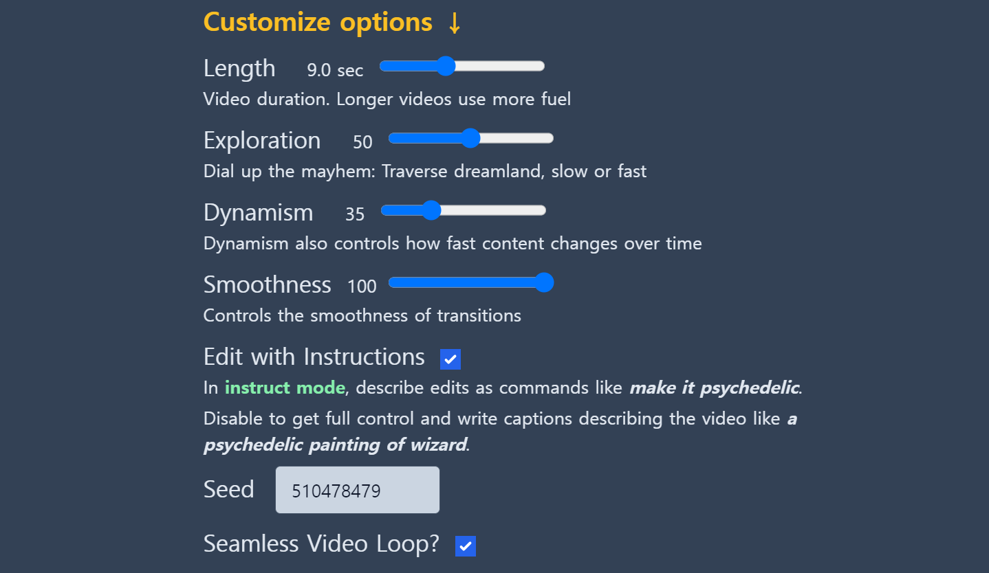 Dynamicsm : 프레임사이의 역동성조절, 값이 낮을수록 일관된 프레임 형성, 값이 높을수록 흥미로운 변환생성